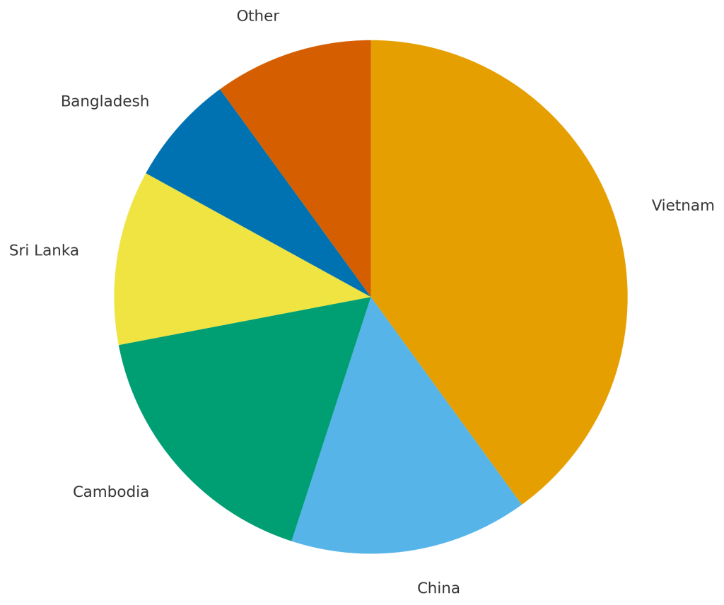 Vietnam currently leads in output, accounting for roughly 40% of Lululemon’s total production. China, once dominant, now contributes about 15%. Other key players include Cambodia (17%), Sri Lanka (11%), and Bangladesh (7%).